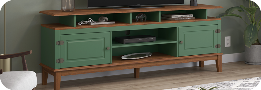 O rack para sala de estar é uma peça funcional e versátil. Além de acomodar a TV, ele organiza eletrônicos, objetos decorativos e ainda contribui para o visual do ambiente. Modelos com portas e nichos ajudam a manter tudo no lugar.