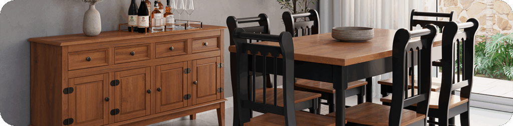 Na sala de estar, por exemplo, racks, estantes e balcões ajudam a organizar o ambiente sem abrir mão do design. Já na sala de jantar, mesas, cadeiras e cristaleiras trazem presença e funcionalidade para momentos de convivência.